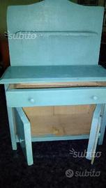 Credenza, mobile basso, tavolo e sedia in legno dipinto di azzurro, gioco anni 50/60. Buone condizioni. La credenza ha il cassetto e le due antine che si aprono, misura lungh. 18, prof. 8,5 cm, altezza 20 cm. Il tavolo è quadrato e misura cm 14x14, altezza 11. Il mobile basso misura lungh. 20 x 8 profondità, altezza cm. 9,5 e le due ante si aprono. La sedia misura 6,5x7, altezza 12. Spedizione esclusa.