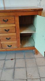 credenza legno chiaro , fatta a mano , con cassetti e 2 ante , rivestita all interno , verniciata , misure 140x 70 x 80 .