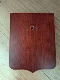 Placca in legno con stemma metallico dorato applicato, finiture eleganti e presenza scenica importante.
