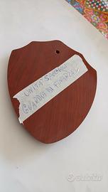 Tutti in legno con placca metallica smaltata.