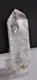 Splendido esemplare di cristallo di quarzo con inclusioni, proveniente dalla provincia di Si Chuan, Cina. Questo cristallo trasparente di grandi dimensioni (14 cm x 4,5 cm) presenta inclusioni minerali che creano affascinanti effetti interni e riflessi luminosi, rendendolo un pezzo unico per collezionisti e appassionati di minerali.