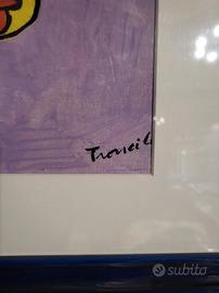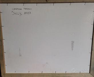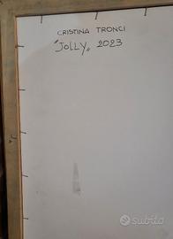 Cristina Tronci si inserisce in un panorama di artisti contemporanei italiani che esplorano il linguaggio della pittura attraverso una visione personale e simbolica. Il suo stile sembra orientato verso l'esplorazione del quotidiano (il gatto) unito a elementi fantastici o simbolici (il Jolly, la figura eterea). L'opera "Jolly" di Cristina Tronci presenta le caratteristiche tipiche di una tecnica mista su carta o cartoncino, uno stile molto comune nell'arte contemporanea di matrice illustrativa e Naïf. La stesura del colore è compatta e coprente, tipica dei colori acrilici o di tempere di buona qualità. Si nota soprattutto nel fondo viola e nel corpo blu della figura a destra, dove il colore appare piatto e senza trasparenze. bordi neri molto netti e definiti che delineano il gatto, il Jolly e il profilo femminile suggeriscono l'uso di un inchiostro fluido (tipo china) o di marker professionali a punta fine e media. Questa tecnica serve a dare "stacco" alle figure rispetto allo sfondo. I piccoli cerchi gialli con motivi a croce e la griglia verde sullo sfondo sono realizzati con pennarelli a smalto o pastelli a cera/olio per ottenere quel contrasto materico e una brillantezza maggiore rispetto alle zone più ampie di colore. L'artista utilizza un linguaggio figurativo-simbolico. Non cerca la sfumatura realistica (come il chiaroscuro o lo sfumato), ma punta sull'espressività del segno e sul contrasto cromatico. È una tecnica che privilegia l'immediatezza del messaggio e l'aspetto decorativo, rendendo l'opera molto simile a un'illustrazione d'autore. Titolo: Jolly Periodo: 2023 Cornice e vetro. Dimensioni: 40x50 Firma autografa in basso e titolo e firma sul retro.