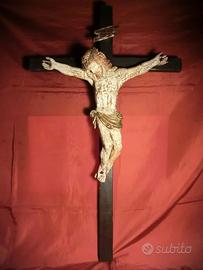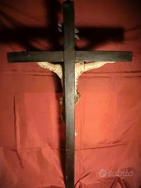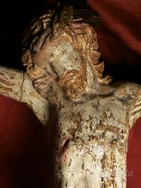 CRISTO CROCIFISSO 1500 – sec. XVI VENEZIA 51 cm Opera: Cristo crocifisso Autore: Anonimo, ambito veneto Datazione: XVI secolo (Cinquecento) Tipologia: Scultura devozionale Dimensioni: •Croce: 95 × 56 cm •Figura del Cristo: 51 cm (altezza totale); • 45 cm (da capo a piedi); 45 cm (apertura delle braccia) Provenienza: Monastero benedettino veneziano Descrizione: L’opera raffigura Gesù Cristo crocifisso secondo un’iconografia di forte impatto devozionale. Il corpo, scolpito con accentuata resa anatomica, è caratterizzato da una torsione naturale e da una tensione muscolare che enfatizza il momento della morte. Il capo reclinato sulla spalla, i capelli mossi e la barba trattata con incisioni profonde contribuiscono a un’espressività intensa e partecipe. Il perizoma (perizonium), annodato sul fianco, presenta un movimento plastico vivace, con pieghe ampie e articolate. Le braccia sono distese orizzontalmente, mentre le gambe, leggermente flesse e sovrapposte, accentuano il senso di abbandono del corpo. La policromia originale, oggi parzialmente consunta, conserva tracce della stesura pittorica che sottolineava il naturalismo dell’incarnato e delle ferite, contribuendo al pathos complessivo dell’opera. Il crocifisso si inserisce nella produzione scultorea lignea del Rinascimento veneto, ambito in cui la tradizione tardo-gotica si fonde con nuove istanze naturalistiche. Nel Cinquecento, soprattutto nei contesti monastici e devozionali, la scultura lignea policroma continua a essere uno strumento privilegiato per la meditazione religiosa. La provenienza da un monastero benedettino veneziano suggerisce una destinazione originaria legata alla preghiera privata o alla devozione comunitaria. Stato di conservazione: L’opera si presenta in condizioni molto buone, considerando l’epoca. Normali segni del tempo, distacchi e abrasioni della policromia, craquelure diffusa, parti mancanti delle dita, croce ridipinta in epoca postuma PREZZO DI REALIZZO NON TRATTABILE!!!!
