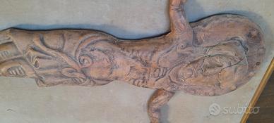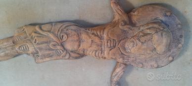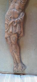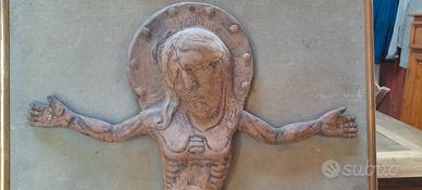 Antica opera devozionale raffigurante Cristo Crocifisso realizzata in terracotta patinata. Il corpo del Cristo è modellato con grande attenzione anatomica evidenziando le costole e i muscoli del torace tipico dello stile gotico. La figura è fissata su un fondo di tessuto in velluto racchiuso da una cornice di legno. Opera con qualche rottura restaurata con tracce visibili come da foto. Dimensioni: H 67 x L 50 cm