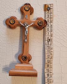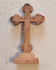 Croce benedetta proveniente da Gerusalemme con relique in legno di olivo alta 16 cm con piedistallo. Come nuova.