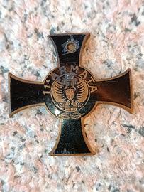 croce commemorativa 11 armata in bronzo dorato e smaltato . distintivo non ufficiale dedicato ai militari italiani che presero parte alla campagna di guerra Grecia e Albania nella seconda guerra mondiale . sul fronte aquila albanese bicefala ad ali spiegate con al centro lo scudo Sabaudo ; sul retro la dicitura veemenza e tenacia 16.11.1940 anno XIX e la firma dell 'autore G.mori .