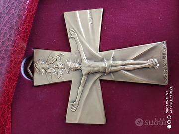 Croce del Giubileo Anno Domini 2000 celebrato da Giovanni Paolo II, in bronzo dorato realizzata da Angelo Grilli. Il diritto rappresenta Cristo risorto, il rovescio i pellegrini di tutto il mondo in cammino verso la Basilica di San Pietro. E' completa con la scatola originale e con il certificato. Solo consegna a mano, no spedizione