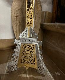 Misure: Croce:Altezza: 61 cm Larghezza: 26 cm Base: 17 cm x 17 cm x 17 cm Cristo in fusione metallica: Altezza testa piedi: 16 cm Altezza braccia/piedi: 19,5 cm Apertura braccia: 11 cm Profondità: 3 cm Misure INRI: 1,5 cm x 2,5 cm Questo crocifisso in legno di arte popolare, estremamente dettagliato e finemente realizzato a mano, non è firmato, ma si ritiene che sia stato realizzato nell'Europa orientale, forse in Austria, intorno al 1920. La croce e il piedistallo sono entrambi finemente intagliati in legno tenero, il tutto arricchito con foglia oro e argento, presesente sulla croce la figura di Gesù in fusione metallica riconducibile all’epoca. Il corpo della croce presenta un traforo di volute e foglie, e un raggio di sole stilizzato che circonda Gesù. Anche le estremità dei bracci e la parte superiore sono decorate con trafori e volute. La croce è costituita da due pezzi di legno uniti con tacche, secondo la tradizione dell'arte popolare primitiva. La base è costituita da una serie di pannelli con trafori tagliati e intagliati, tenuti insieme da giochi d’incastri per formare la base. Si tratta di un crocifisso di arte popolare piuttosto grande e ben eseguito, e in più che buone condizioni.