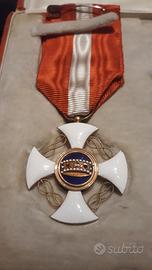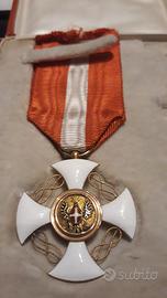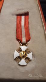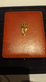 Cedo uno "stupendo" nonché "raro" cofanetto della nota ditta Luigi FASSINO di Torino, conosciuta per le sue produzioni di altissimo valore artistico, che comprende la croce da Cavaliere dell'Ordine della Corona d'Italia del periodo in cui regnante Vittorio Emanuele III (1900-1943) e la sua relativa miniatura. La fattura della decorazione in argomento fu realizzata nei "primissimi" anni del '900 (cd. "alla francese") in bronzo dorato e smalti, con filamenti in oro 18 KT (carati) a forma di nodi sabaudi che uniscono i bracci della croce. Bella ed affascinante "FONTE MATERIALE" dell'Ordine cavalleresco del Regno dei Savoia. Sul dritto della decorazione è raffigurata l'aquila sabauda coronata con scudo crociato distintivo del casato, mentre sul verso, è raffigurata la corona dei regnanti d'Italia nella realtà tutta tempestata di pietre preziose. Sia la croce che la miniatura sono rivestite del loro nastrino originale di 14 cm in piega coeva di 7 cm per la croce e 9 cm in piega di 4,5 cm per la miniatura. Sul cofanetto è presente il monogramma di Re Vittorio Emanuele III sormontato da una corona (anche il cofanetto si presenta in buonissime condizioni). Il cimelio cavalleresco si presenta in "OTTIME" condizioni di conservazione, ancora in patina d'epoca, senza né rotture, né mancanze e/o difetti alcuno. Le sue misure sono: 35 mm x 35 mm (asse x asse) per la croce e 17 mm x 17 mm (asse x asse) per la mignon. Le affascinanti decorazioni vengono vendute con relativa dichiarazione d'autenticità, che ne impreziosisce il valore della stessa in collezione e la garantisce "A VITA" contro gli "innumerevoli" falsi in circolazione. Tutto "rigorosamente" originale d'epoca al 100% e garantito. Spedizione: Pacco tracciato (10 euro);