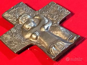 Bellissima croce pendente, spessa placca fusione in bronzo raffigurante la croce con albero della vita, con al centro il buon pastore padre famiglia, nel retro su tutta la superfice scritta in alto rilievo un motto in tedesco. In ottimo stato come da foto misure generali cm.7,5x9,3x0,4.