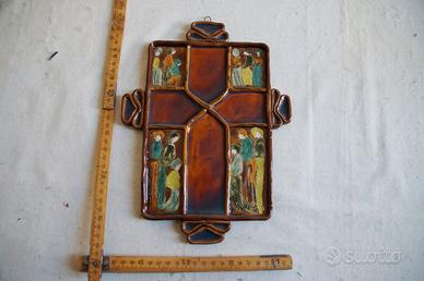 Ceramica Cagliaritana smaltata raffigurante una croce con, ai quattro riquadri ad angolo, uomini e donne che pregano. Ottima fattura. Condizioni come da foto (no scheggiature). Dimensioni dell'oggetto: 28 cm x 21 cm