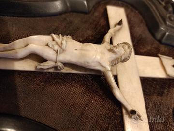 antico crocefisso in osso di pregevole fattura, montato su una acquasantiera in legno, il Cristo e'intatto