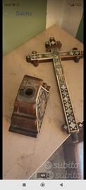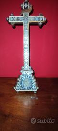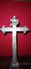 Crocefisso con struttura lignea e applicazioni di madreperla incisa e intarsi di osso, fine del XIX secolo, (1870-1890 circa), Gerusalemme Terra Santa. Buono stato di conservazione.