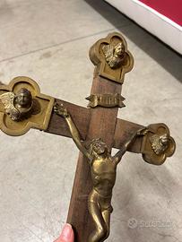 Crocifisso in legno con Cristo in bronzo dorato applicato e terminali trilobati decorati con teste di cherubini in metallo. Cartiglio INRI in bronzo. Oggetto di produzione artigianale, di gusto tardo ottocentesco, destinato ad uso domestico o oratoriale. Buona patina del metallo, legno con normali segni del tempo.