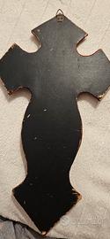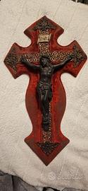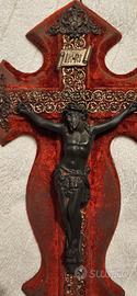 Crocifisso da muro in bronzo argento e velluto rosso. Segni del tempo su velluto.