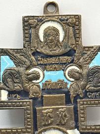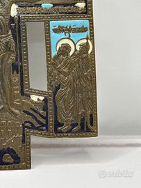 Importante crocifisso in bronzo tutto lavorato con scene religiose, è impreziosito da smalti a fuoco policromi, provenienza Russia centrale.