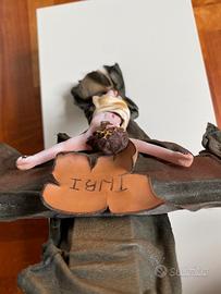 Crocifisso da parete vintage realizzato a mano su base di truciolato sagomato rivestito in pelle scura con sfumature bronzo cm. 35X21 modellata con drappeggi. Cartiglio INRI in pelle color cuoio. Il Cristo con panno in pelle color avorio + dettagli oro è dipinto a mano. D-ring per appendere.