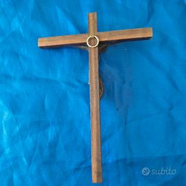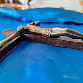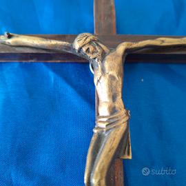 Crocifisso da parete vintage di legno verniciato e bronzo. Circa 20x15 cm