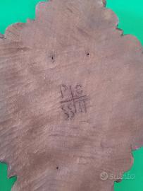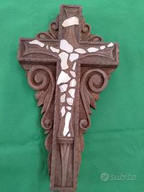 bellissimo crocifisso in legno e madre perla con mani che lo soregono, in ottime condizioni altezza 43 cm. larghezza 27cm. profondità 11 cm.