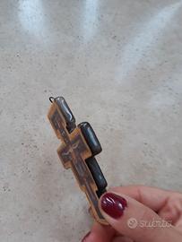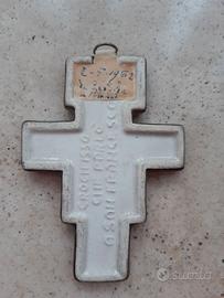Crocifisso San Damiano "Che Parlò a San Francesco", dovrebbe essere in ceramica. Sul retro c'è un piccolo gancio per appenderlo e una piccola etichetta con dedica, che non si riesce a rimuovere. Indica come anno 1952 o 1962. Dimensioni: 8 x 6 cm.