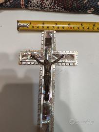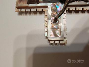 Crocifisso vintage in madreperla e legno di ulivo sul retro, il marchio sul retro ne indica la provenienza, Gerusalemme, manca un angoletto come si vede dalla foto. Il crocefisso è di grande dimensioni, 20 cm per 12 cm.