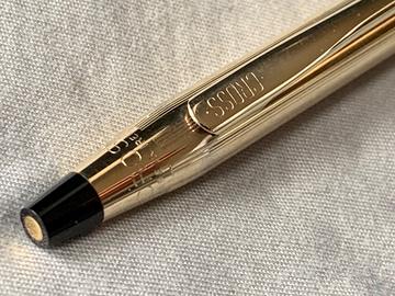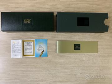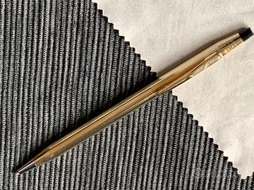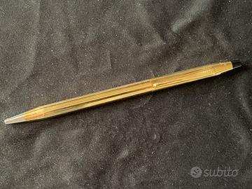 Penna a sfera Cross Classic Century laminata in oro 10 kt made in IRELAND (produzione da paese abbastanza raro attualmente) con astuccio di lusso completo di libretto istruzioni, foglio informazioni e copertura in cartone protettiva.