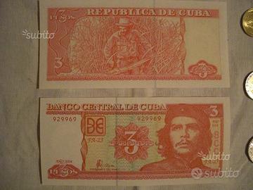 Vendo inoltre sempre per collezione la banconota cubana sempre da 3 pesos assolutamente originale e perfetta con sul recto l'effigie di Ernesto "Che" Guevara e sul verso la rappresentazione dello stesso Che al "Trabajo volontario" mentre raccoglie la canna da zucchero. Emissione 2004.