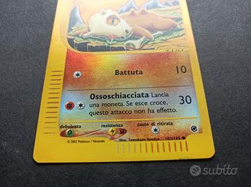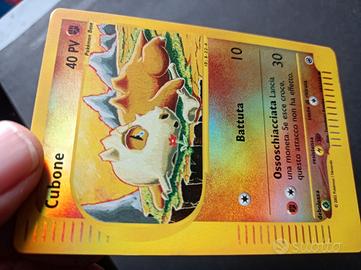 Vendo rara carta Cubone 103/165 in versione Reverse Holo, proveniente dal set Expedition Base Set (2002) - Era Wizards of the Coast. Condizioni: Excellent (EX). La carta presenta i classici micro-graffi superficiali sulla parte olografica (visibili nelle foto controluce) e un leggero whitening sui bordi del retro, tipico dell'età. Artwork: Il celebre e toccante disegno del maestro Tomokazu Komiya. Edizione: Italiana, originale dell'epoca e-Reader. Ottimo pezzo per chi sta completando il Master Set di Expedition. Spedizione protetta con sleeve e toploader o consegna a mano zona Nonantola/Modena.