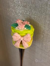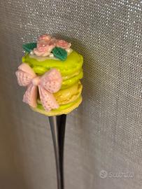 Due dolci macaron al pistacchio realizzati in porcellana fredda adagiati su un cucchiaino