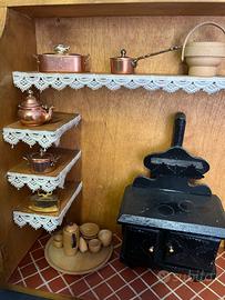 Cucina da gioco vintage. Molti bellissimi oggetti in rame e legno. Fatto a mano. Dimensioni: 33x27x9cm.