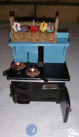 10 euro Fornello 4 fuochi, forno con griglia estraibile con scaffale e accessori (2 padelle in rame + mestolo) + set vasi 5 fiori