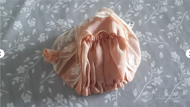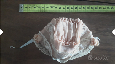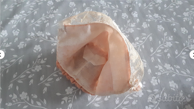 Cuffietta per bambola poupee doll Descrizione: in fine cotone rosa antico, con sottile merletto e roselline. Primi 900. E' stata cucita a mano e interamente foderata. I nastrini di chiusura sono da sostituire. Dimensioni: 18 (larghezza) x 8 cm circa (altezza). Condizioni: Molto buone. Conservato in praticamente perfetto stato.