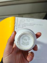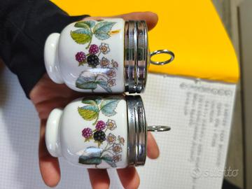 Questi oggetti sono cuociuova in porcellana (egg coddlers) vintage della marca Royal Worcester, modello Lavinia. Servono per cuocere le uova a bagnomaria direttamente all'interno del vasetto, permettendo di aggiungere condimenti prima della cottura. Il modello Lavinia è caratterizzato da un motivo decorativo di more e fiori su fondo bianco. Sono dotati di un coperchio in metallo avvitabile con un anello superiore per sollevarli facilmente dall'acqua bollente. Articoli sono molto ricercati dagli appassionati di porcellane inglesi e utensili da cucina vintage.
