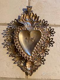 Vendo splendido e raffinato cuore votivo (Ex-Voto) realizzato in argento, caratterizzato da una lavorazione di alta qualità. L'oggetto presenta il classico monogramma "GR" (Per Grazia Ricevuta) in rilievo dorato al centro, simbolo di gratitudine e devozione.
