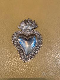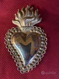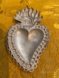 Cuore votivo devozionale ex voto, caratterizzato da cuore centrale bombato, cornice perlinata e fiamma sommitale, simbolo del Sacro Cuore e della devozione popolare.