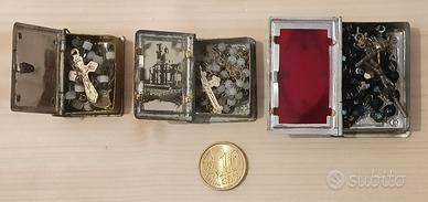 Tre piccoli cofanetti in metallo a forma di libro, contenenti piccoli Rosari. Quello più grande presenta la mancanza dell'anellino di congiunzione con il Crocifisso, sostituito non recentemente con filo. A