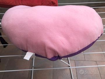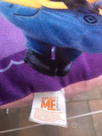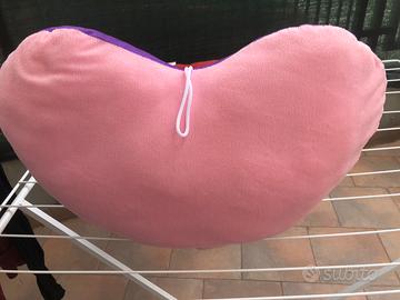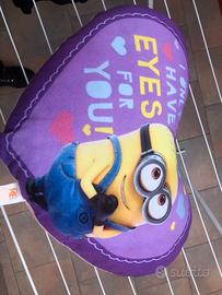 Vendo un grosso cuscino rosa, viola e fucsia a forma di cuore gigante usato con la stampa dei Minions di Cattivissimo Me.