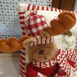 Bellissimo e morbidissimo cuscino d'arredo natalizio con simpatica renna. Usato, lavato, pulito, ⚠️ segnalo la presenza di piccoli segni d'uso come: la mancanza di alcuni brillantini tra le foglie del pungitopo e qualche filo tirato ( vedi foto)