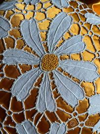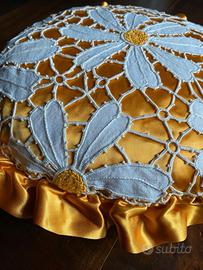 Cuscino in seta gialla e ricamo a mano in cotone ecrù . Forma rotonda con diametro di cm. 35 + cm. 4 di voulant .