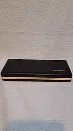 con interno in raso chiaro e logo dorato con claim , si apre e si chiude perfettamente chiude perfetramente .