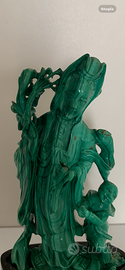 Scultura in Malachite raffigurate "Dama Cinese con Fiore di Loto e Bambino" poggiata su base in legno.