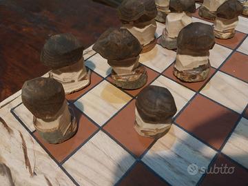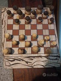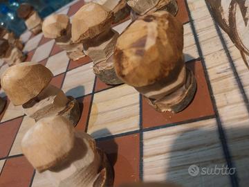 lo stesso dicasi per le pedine (funghi neri / bianchi) lavorati e dipinti a mano dunque tutti pezzi unici (uno diverso dall’altro)