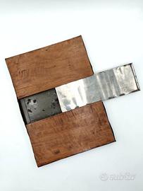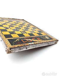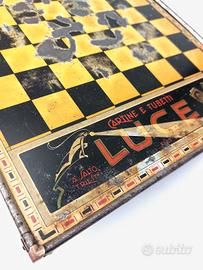 Rarissima dama o scacchiera anni 30 in latta litografata con pubblicità a tema sigarette Luce ed Excelsior, utilizzata nei bar. Nello stato in cui si trova, misure: 35 x 25 x 2 cm.