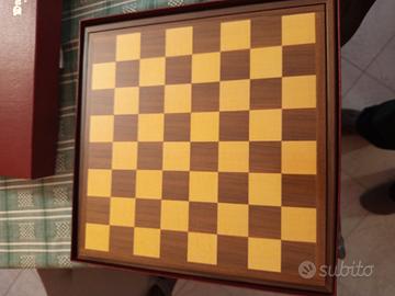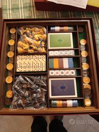 Damiera dal negro mai utilizzata con pedine, scacchi ,carte da gioco, tessere domino e dadi ancora incartati.