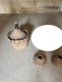 Damigiana in vetro verde scuro, lavorata e rivestita in vimini, con cesto intrecciato, impagliata, copertura o cappello in vimini - paglia, fondo in legno, manifattura artigianale fatta a mano.