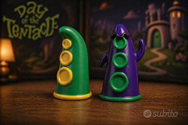 DESCRIZIONE Per chi ha vissuto l’epoca d’oro delle avventure grafiche, Day of the Tentacle non è stato solo un gioco, ma un ricordo indelebile. Un capolavoro firmato LucasArts, capace di unire humor, creatività e personaggi diventati iconici per un’intera generazione di giocatori. Questa coppia di tentacoli nasce come omaggio artigianale a quel mondo, realizzata con passione da un appassionato per altri appassionati. Esposti insieme, richiamano immediatamente l’atmosfera del gioco e diventano un elemento distintivo in qualsiasi collezione retro gaming. Non sono oggetti industriali. Sono pezzi realizzati uno alla volta, con attenzione e cura. 🎨 REALIZZAZIONE ARTIGIANALE Ogni tentacolo viene: ✔ Rifinito manualmente ✔ Dipinto completamente a mano ✔ Protetto con vernice trasparente acrilica protettiva ✔ Controllato singolarmente Ogni coppia presenta leggere variazioni naturali che rendono ogni pezzo unico. 🔢 LIMITED EDITION NUMERATA Questa edizione comprende: ⭐ 50 tentacoli verdi (V-01/50) ⭐ 50 tentacoli viola (P-01/50) Ogni base è incisa manualmente con il proprio codice progressivo. Una volta completate entrambe le serie, questa edizione verrà definitivamente chiusa. 📏 DIMENSIONI Altezza di ciascun tentacolo: circa 10 cm Finitura: Dipinti a mano e protetti con trasparente acrilico Produzione: Artigianale Perfetti per: Collezioni retro gaming Esposizione su mensole Decorazioni per ambienti gaming Regali nostalgici per appassionati ⚠️ NOTA IMPORTANTE Oggetti ispirati al celebre universo di Day of the Tentacle, creato da LucasArts. Non sono prodotti ufficiali, ma creazioni artigianali indipendenti