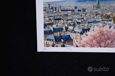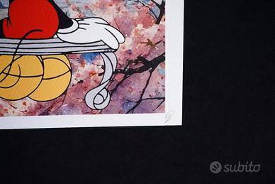 Bellissima opera della celebre street artist newyorkese DEATH NYC. Un mash-up unico che vede Topolino e Minnie ammirare un paesaggio onirico che unisce la Torre Eiffel di Parigi e il Monte Fuji giapponese tra i fiori di ciliegio.