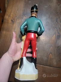Vendesi raro decanter da collezione in ceramica del liquore irlandese Irish Mist, prodotto dalla storica manifattura italiana Coronetti Cunardo (Varese) intorno agli anni '70. Il pezzo raffigura un soldato della Brigata Irlandese in alta uniforme (giubba verde e pantaloni rossi). Si tratta della versione grande, alta circa 48 cm, molto più scenografica rispetto alle miniature comuni. Caratteristiche e Condizioni: Produttore: Coronetti Cunardo - Made in Italy (marchio presente sul fondo). Dimensioni: Altezza 48 cm circa, Larghezza 14 cm. Stato: L'oggetto presenta alcuni segni del tempo sulla vernice (piccole sbeccature visibili in foto) che ne testimoniano l'originalità vintage. Nota: Il decanter è privo di tappo, ideale come pezzo d'arredo, per amanti del genere militaria o come ricambio per chi possiede già il tappo originale. Ottimo pezzo da esposizione per amanti del vintage, collezionisti di bottiglie pubblicitarie o oggettistica da bar/man cave.