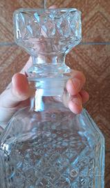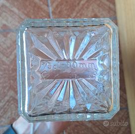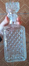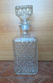 Decanter vintage in vetro trasparente lavorato con decorazione geometrica a rilievo. Bottiglia (vuota) di forma rettangolare, con tappo quadrato con chiusura in plastica a pressione. Lavorazione raffinata su tutta la superficie: rombi geometrici. Perfetta come bottiglia per liquori (whisky, grappa, amari), o decanter da tavola, o ancora come oggetto decorativo per arredamento vintage, taverna o bar. In stile retrò. In buone condizioni generali, vetro integro senza crepe. Normali segni del tempo. Misure: altezza con tappo 24cm circa; lati 8x8 cm. Impressa sul fondo la scritta “75cl, 30mm”. Prezzo trattabile