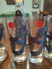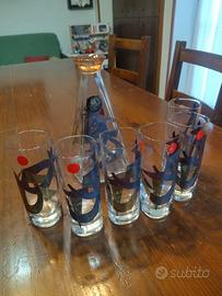 Decanter piramidale misura cm. 12×12 altezza cm 25 vintage anni 70 più 6 bicchieri tumbler, altezza cm. 15, con motivi a nastro astratto in colori iridescenti (Bormioli) prodotto da Cristalleria Europa Sud.